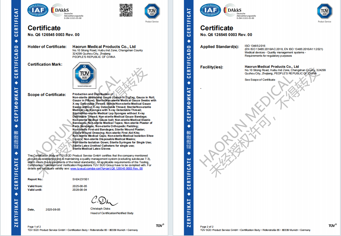 Para mejorar aún más la calidad, completamos la publicación de nuestros documentos de Manual y Procedimiento de Calidad en septiembre de 2023. Según esto, mejoramos los documentos del sistema de gestión de calidad en enero de 2024, agregando contenido relacionado con MDR. Pasamos la primera etapa de la auditoría TUV SUD el 10 de abril de 2025 y luego la segunda etapa. Finalmente, en agosto de este año, nuestro número de certificado estuvo disponible para la visualización en el sistema del cuerpo notificado, marcando un nuevo paso adelante en el sistema de gestión de calidad de Haorun Medical y fortaleciendo las bases de la compañía para el desarrollo. Nuestros consumibles médicos desechables (gasa, rollos de gasa, vendajes de gasa, etc.) brindan a los clientes en todo el mundo una calidad y servicio de productos superiores.