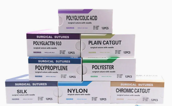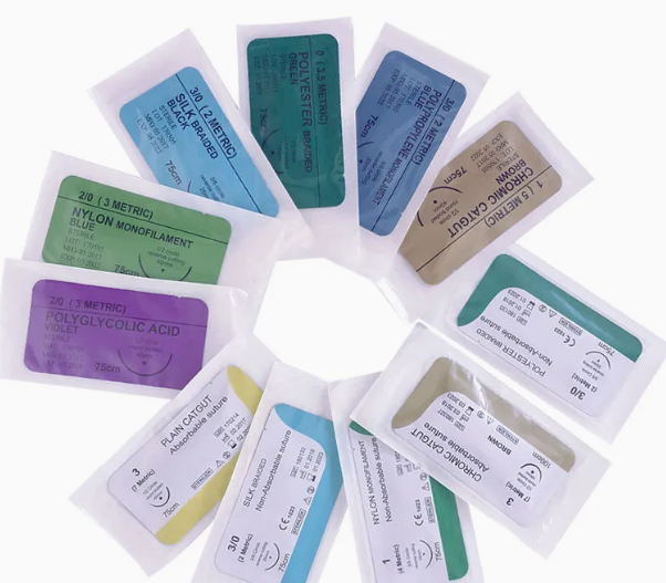 5. Tamaños y materiales de múltiples, disponibles en opciones absorbibles (por ejemplo, Vicryl, Monocryl) y no absorbibles (por ejemplo, nylon, seda).